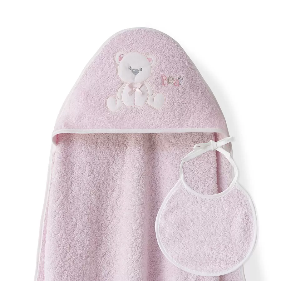 La capuche, indispensable pour sécher les cheveux, est décorée d’une broderie soignée représentant un ours avec un nœud, rehaussée par un biais de contour Rose.