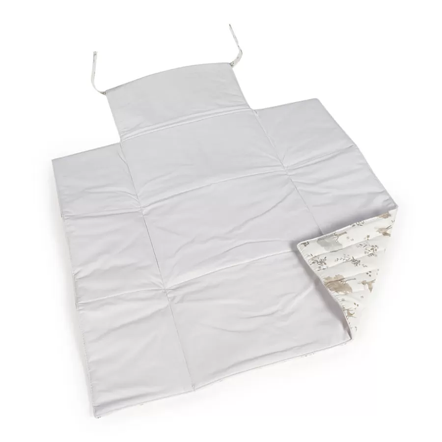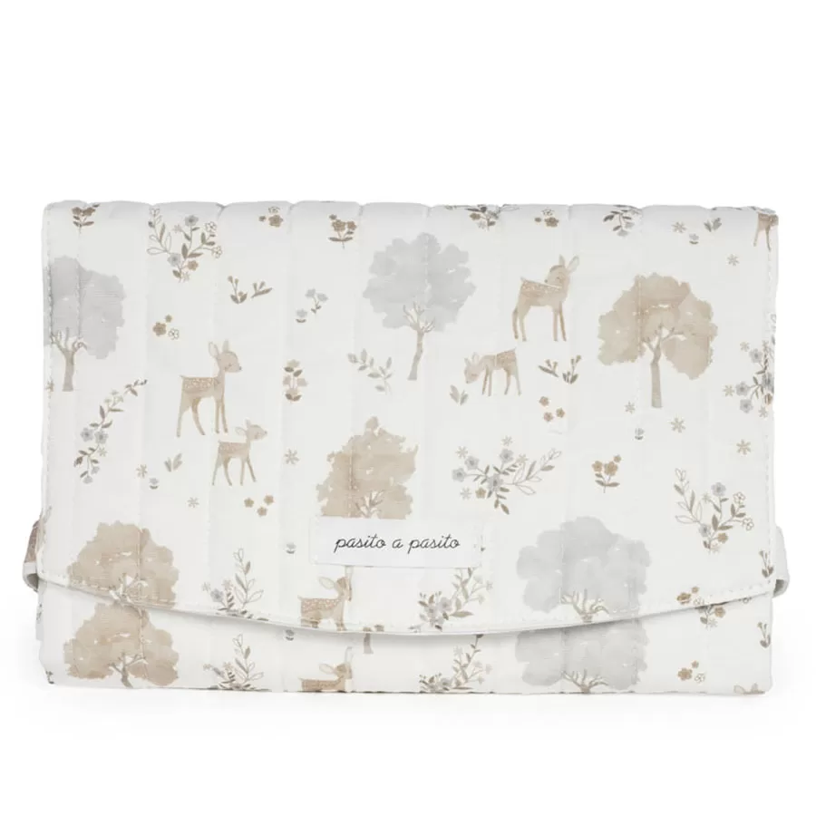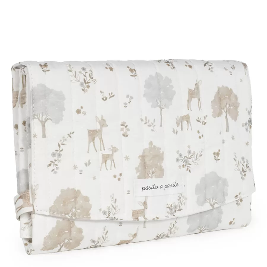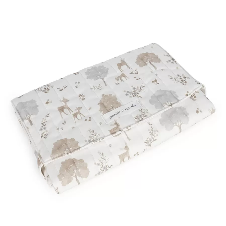 Le matelas à langer Nara de Pasito a pasito, fabriqué en toile de coton 100 % avec un délicat imprimé de cerfs et d’arbres dans des tons neutres, est un modèle très confortable, pratique et facile à transporter. Un motif spécialement conçu pour une utilisation lorsque vous avez besoin de changer votre bébé. Il est pliable pour faciliter son transport. Son design est aussi élégant que fonctionnel, car il se présente sous un format plié pour le rendre portable. Il possède des sangles de fermeture pour maintenir le matelas à langer fermé, réduisant ainsi l’espace nécessaire pour le transporter dans votre sac de maternité. Finition de qualité. Le matelas à langer est doté d’une doublure intérieure rembourrée et imperméable pour faciliter le nettoyage après utilisation et éviter l’accumulation d’odeurs à l’intérieur. Il est fabriqué à partir de matériaux de haute qualité, sans colorants azoïques, phtalates et substances nocives pour la santé. Il peut également être lavé à la main ou en machine à des températures allant jusqu’à 30º. Les produits pour bébés Pasito a Pasito ont un design très différent de tous les autres ; grâce à ses collections les plus élaborées, fantaisistes et en même temps pratiques, qui utilisent des matériaux de première qualité pour souligner l’élégance et l’harmonie de chacune de ses pièces. Nos modèles sont exclusifs et d’un style incomparable, conçus pour les mamans modernes qui ont du goût et apprécient les détails autant que nous. Spécifications : Matériaux : 100 % coton. Dimensions : 50 x 70 cm.