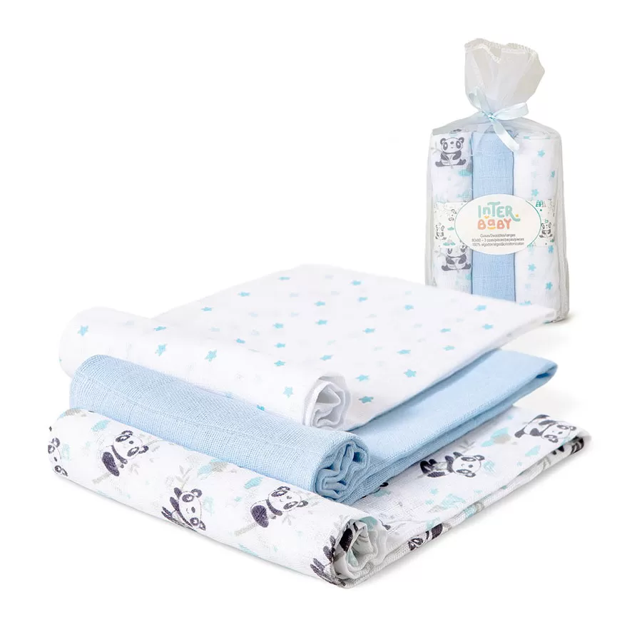 Interbaby – Lot de 3 Langes Mousseline 80×80 cm – Modèle « Panda » – 100% Coton – Bleu